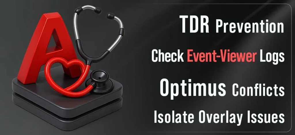 | Freeze/Driver Reset (TDR) | پایداری درایور/اورکلاک/گرما | Event Viewer → Display ID 4101 | حذف اورکلاک؛ بستن اورلی؛ کاهش بار صحنه | آپدیت تمیز درایور؛ بهبود تهویه؛ تنظیم TdrDelay (با احتیاط) | هدف: دمای پایدار و عدم افت کلاک |