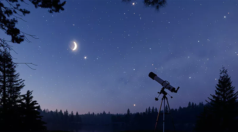 یک کابین مدرن که در کنار دریاچهای زیر آسمان پرستاره و ماه کامل روشن در پسزمینهٔ کوههای دور و درختان کاج اطراف نورانی شده است.