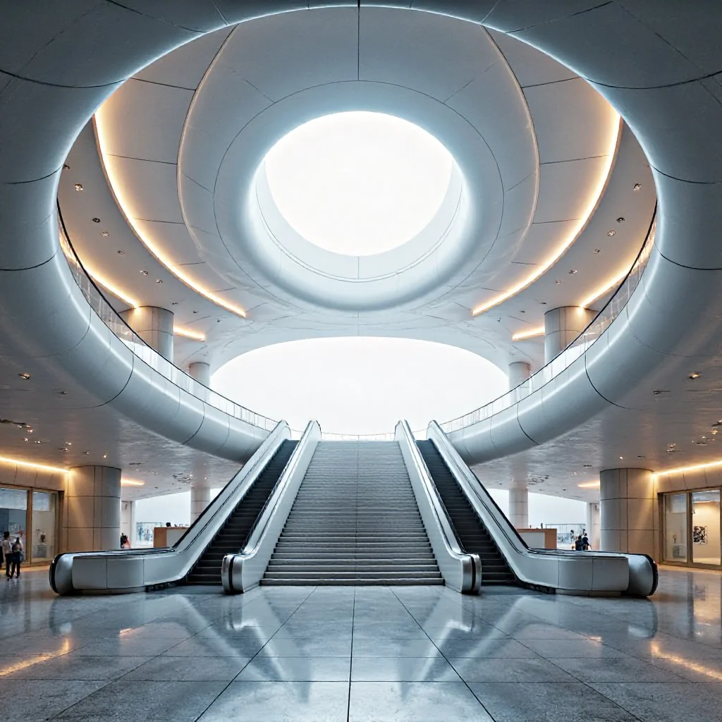 A futuristic architectural hub with sweeping curves and a circular roof, viewed symmetrically from below. Broad steps and escalators lead upward under soft, diffused light, conveying openness, precision, and modern elegance.