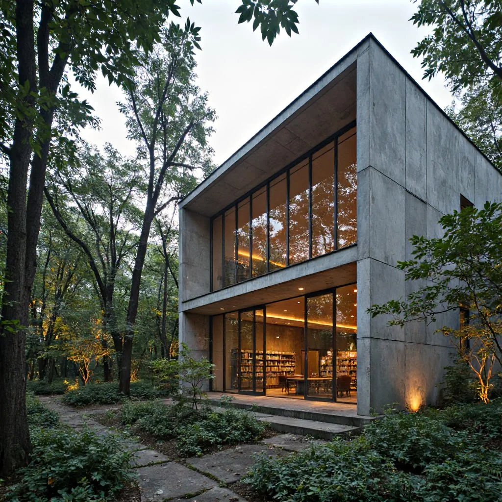 A modern minimalist library surrounded by lush greenery and tranquil gardens. The structure features clean lines, exposed concrete, and wide glass panels that blend interior and exterior. Soft golden-hour light highlights the harmony between architecture and nature, evoking calm sophistication.