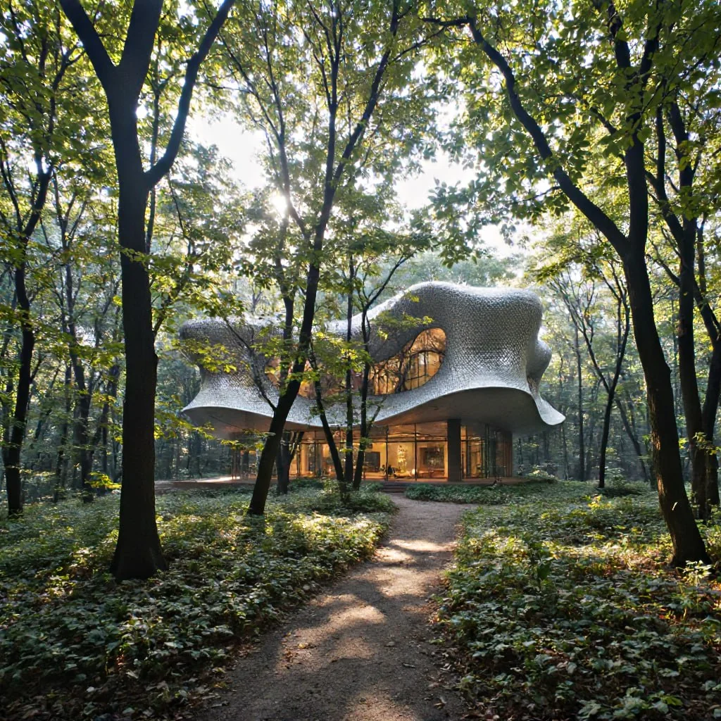 A contemporary art museum with flowing, organic shapes nestled in a dense, colorful forest. Its metallic lattice façade plays with light and shadow, and a winding path leads to the entrance. Early morning light creates a peaceful, cinematic atmosphere of modern elegance and natural integration.