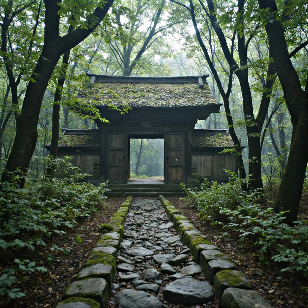 A classic wooden Japanese gatehouse nestled in a misty, green forest. Moss-covered stones line the narrow path leading to the entrance, while soft morning light filters through the trees. The mood is meditative and timeless, blending architecture and nature in quiet harmony.