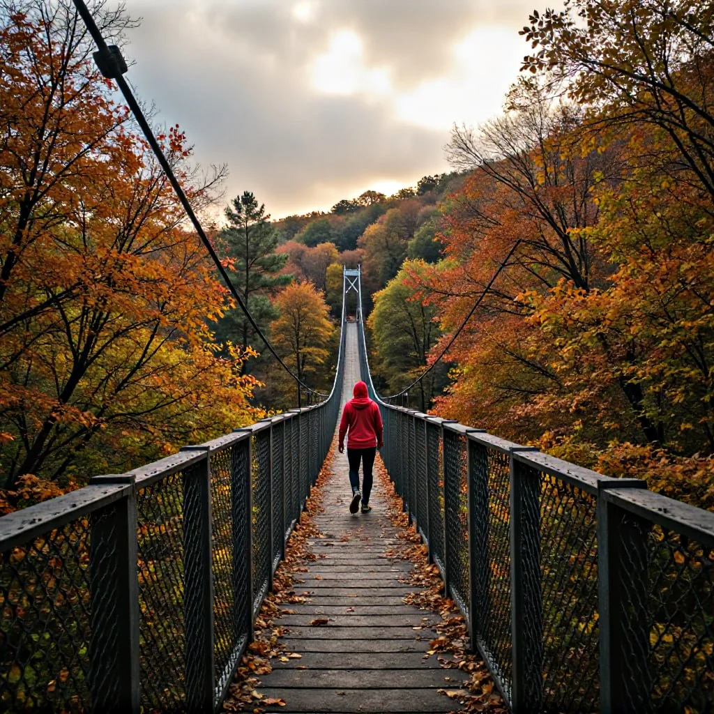 A low-end photograph of a grand cable suspension bridge, extending into a lush, forested valley in autumn season, bathed in warm golden light. Forest trees with pumpkins orange and yellow, brightly coloured leaves. Sky is overcast with dynamic lighting at dusk. A single person walks mid-bridge wearing red hoodie, tranquility, and human connection to nature.