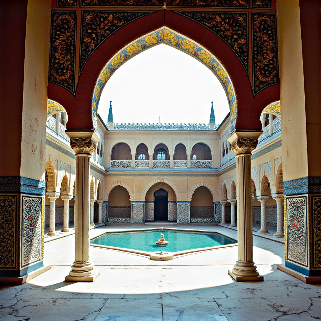 An ornate interior with colorful tiled arches framing a symmetrical courtyard and central pool. Bright daylight enhances the vivid patterns and geometric details, evoking cultural richness, balance, and serene beauty.