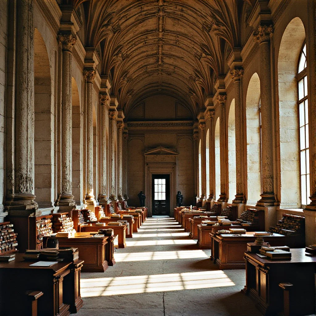 A grand, baroque style stone made, reading room filled with wooden desks and soft lamp light. High ceilings and ornate detailing reflect timeless craftsmanship, while diffuse volumetric daylight creates a calm, scholarly mood rich in atmosphere and history.