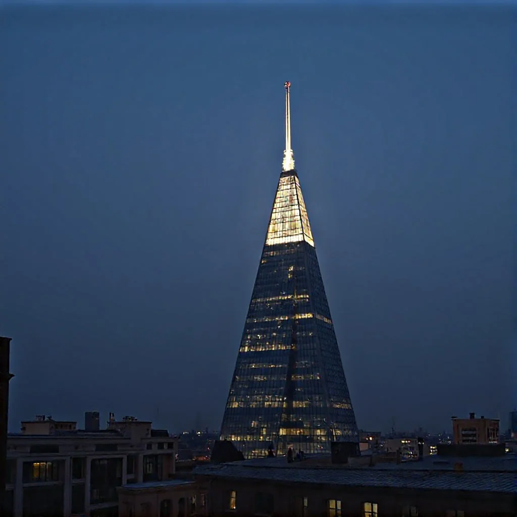 A bold, geometric tri-angular building rising above the city at dusk. The soft, dim light enhances the structure’s dramatic form and verticality, creating a sense of quiet power and architectural grace.