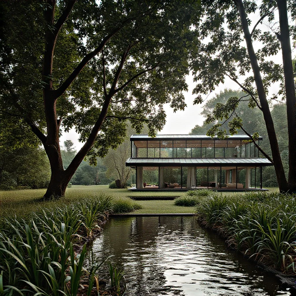 A contemporary tropical home with glass walls and a flat, green roof surrounded by dense foliage. The building appears to float over shallow reflective water under soft, overcast light. The atmosphere is serene and contemplative, emphasizing harmony with nature and minimalist design.